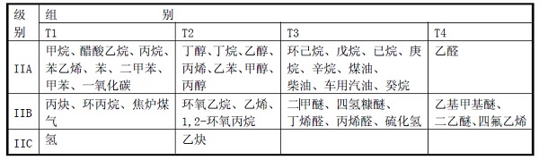 II 類 除煤礦外的其他爆炸性氣體環境用電氣設備。II 類爆炸性氣體的特性進一步分類為:IIA、IIB、IIC。II 類常見可燃性氣體、蒸氣、溫度組別見下表 II 類 用于除煤礦以外的爆炸性粉塵環境,III 類再分類:IIIA 類:可燃性飛絮 ; IIIB類:非導電性粉塵;IIIC 類:導電性粉塵;