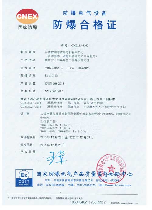 本系列電動機符合 GB755-2008《旋轉電機定額和性能》、企業標準Q/320206JLAB88-2010《YBK3系列煤礦并下用隔爆硯三相異步電動機技術條件(機座號H100-355)》。其防爆性能符合BG3836.1-2010《爆炸性環境第1部分:設備通用要求》和GB3826.2-2010《爆炸性環境第2部分:由隔爆外殼"d"保護的設備》、也符合MT451一l995《煤礦用隔爆型低壓三相異步電動機安全性 能通用技術規范》的規定,制成隔爆科ExdI適用于煤礦井下爆炸性氣體環境的危險場所。也符合IEC79-1,BS4683和EN50018的規定,制成隔爆型。防爆標識為ExdI Mb,使用有爆炸性氣體混合物存在的場所。ExdI Mb適用于煤礦采掘工作面具有甲烷或煤塵的爆炸性混合物存在的工作環境。