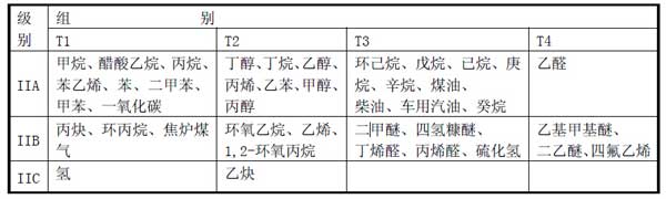 II 類 除煤礦外的其他爆炸性氣體環(huán)境用電氣設(shè)備。II 類爆炸性氣體的特性進(jìn)一步分類為:IIA、IIB、IIC。II 類常見(jiàn)可燃性氣體、蒸氣、溫度組別見(jiàn)下表 II 類 用于除煤礦以外的爆炸性粉塵環(huán)境,III 類再分類:IIIA 類:可燃性飛絮 ; IIIB類:非導(dǎo)電性粉塵;IIIC 類:導(dǎo)電性粉塵;